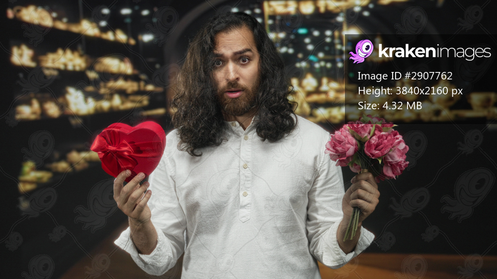 Man holding red heart box and pink bouquet in a museum gallery, offering both items with a hesitant expression; romantic hesitation.