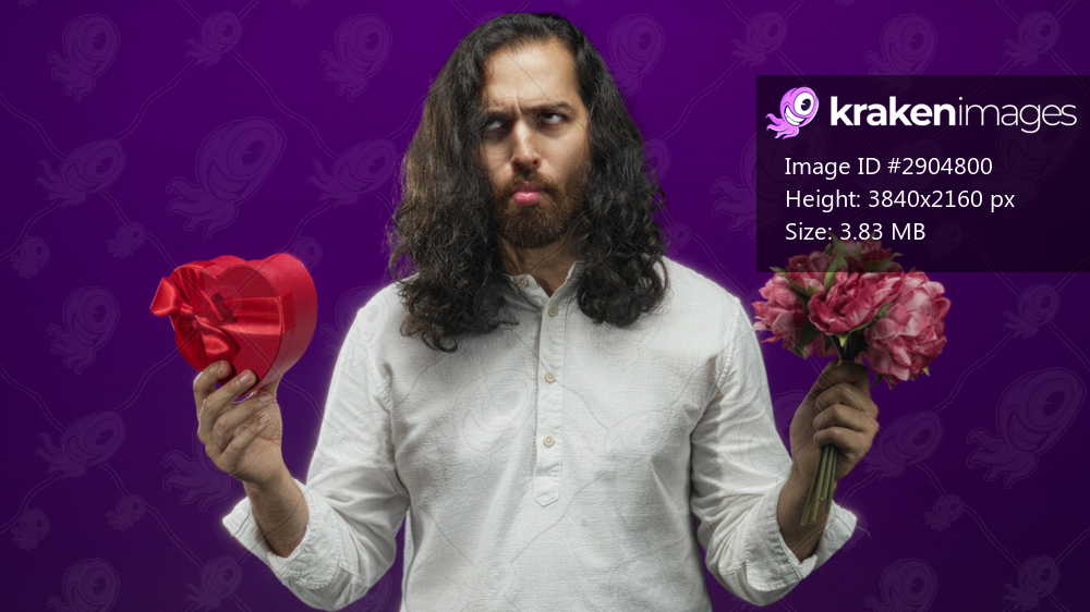 Man holding red heart box and pink bouquet, lips pursed and eyebrows furrowed in studio; confusion indecision.