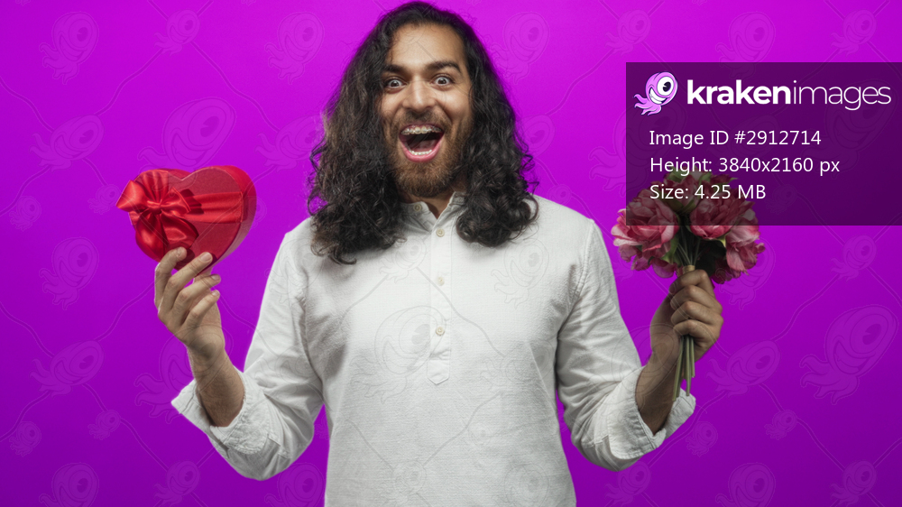 Man holding red heart box and pink bouquet smiling with open mouth showing braces in magenta studio; romantic joy surprise.