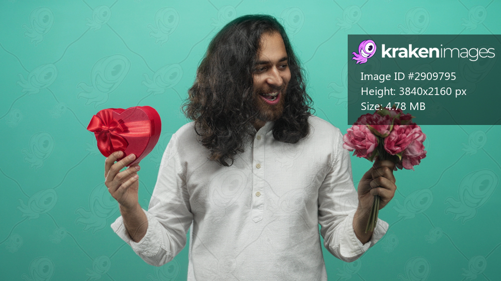 Man holding red heart box and pink flowers bouquet while smiling and looking at gift in teal studio; romance surprise.