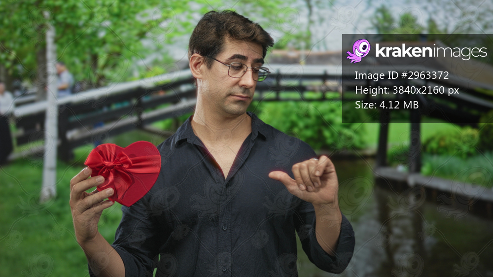 Man holding red heart gift box with bow points finger to chest near wooden bridge in forest; hesitation romantic plea.