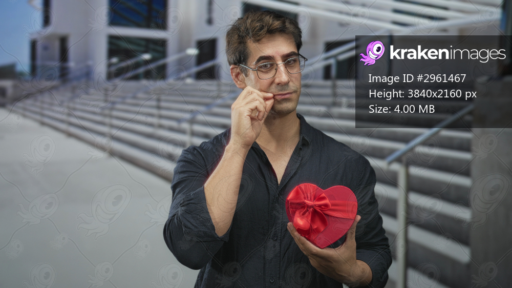 Man holding red heart gift box, points finger and touches cheek on building steps; romantic playfulness.