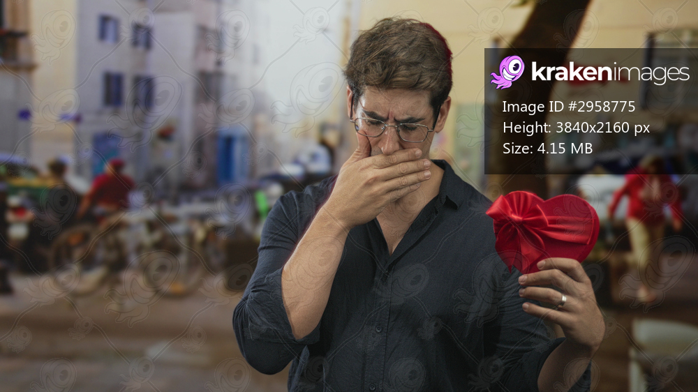 Man holding red heart gift with hand to mouth on street, examining ribbon and bow with pained expression; heartbreak sadness.