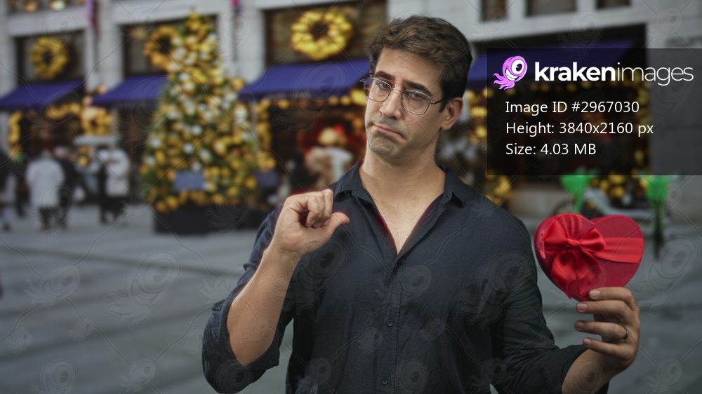 Man holding red heart gift in hand on street outside decorated storefront with christmas tree, wreaths and ribboned box; romantic hesitation.