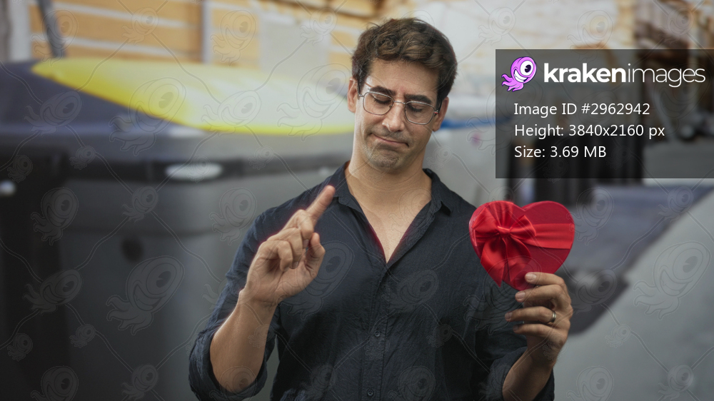 Man holding red heart gift in his right hand and showing left thumb down on a street alley; rejection heartbreak.