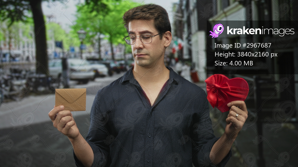 Man holding red heart gift and kraft envelope on a city street, wearing glasses and ring, neutral contemplative pose; hesitation decision.