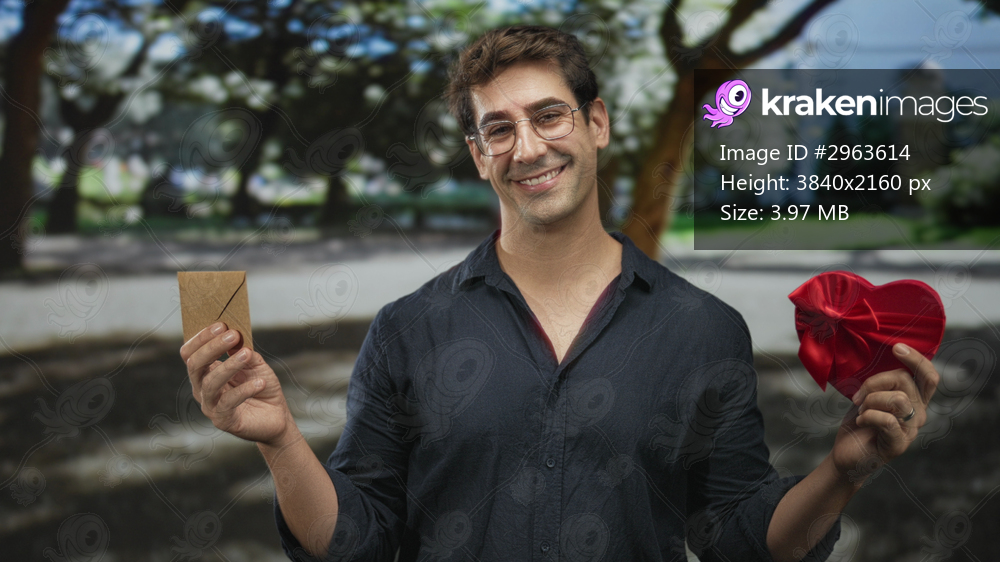 Man holding red heart gift and small brown envelope with hands, smiling on street under trees; romantic proposal.