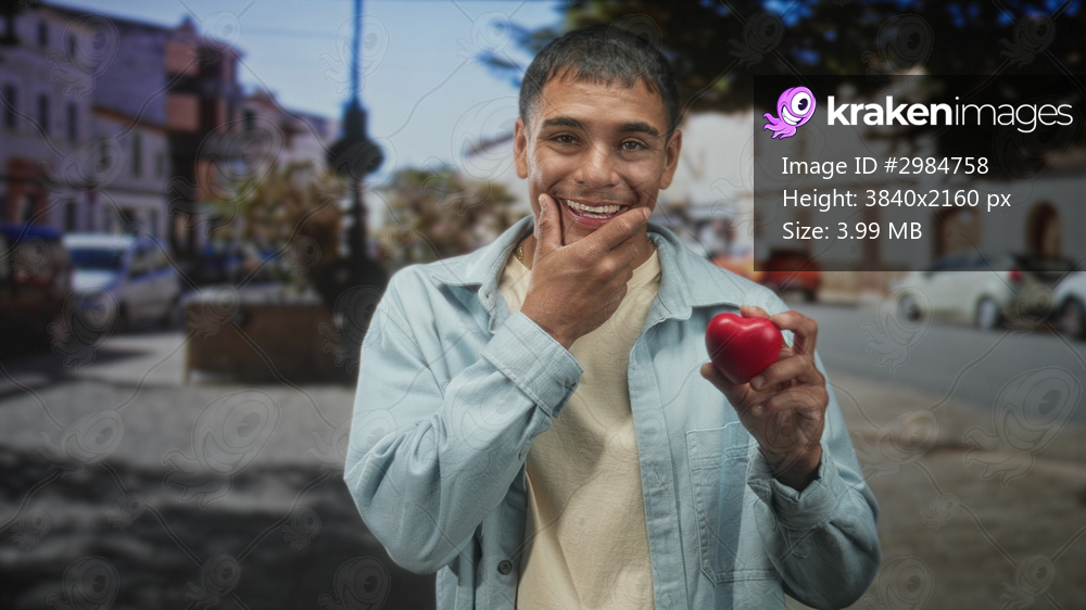 Man holding red heart in right hand, covering face with left hand and looking down on street; health hope love.