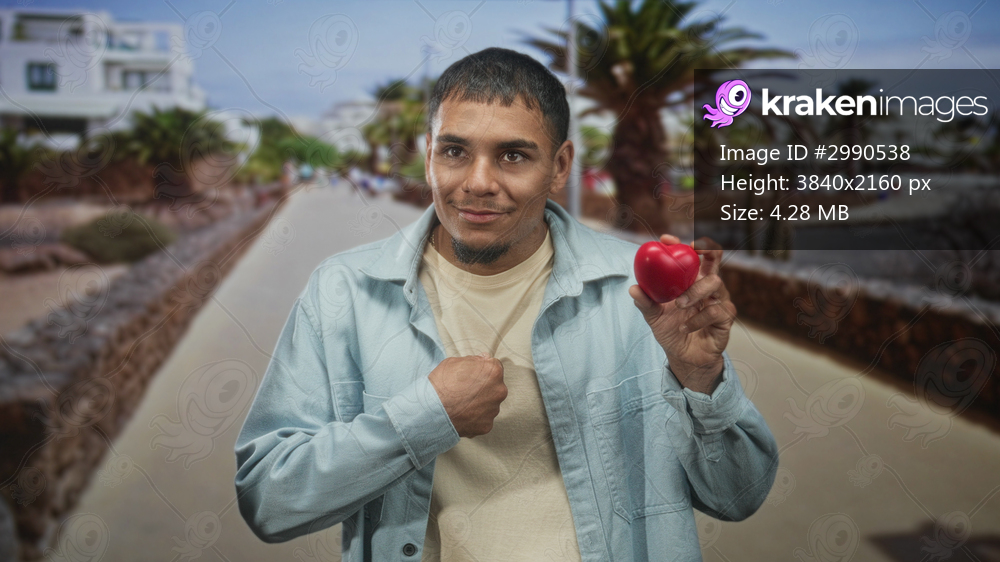 Man holding red heart prop in right hand and clutching shirt at chest on a sunny palm lined street by the coast; compassion health awareness.