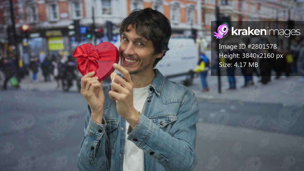 Man holding red heart shaped gift box near smiling face in bustling crowded urban street; love romance.
