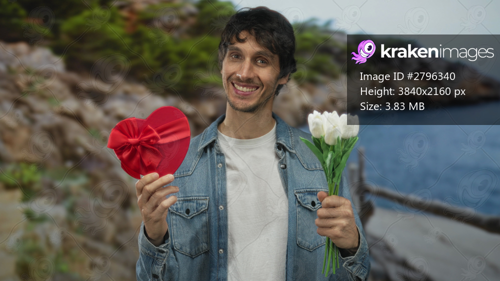 Man holding red heart shaped gift box and white tulips smiling on street by a wooden railing along a rocky coast; romance celebration courtship.