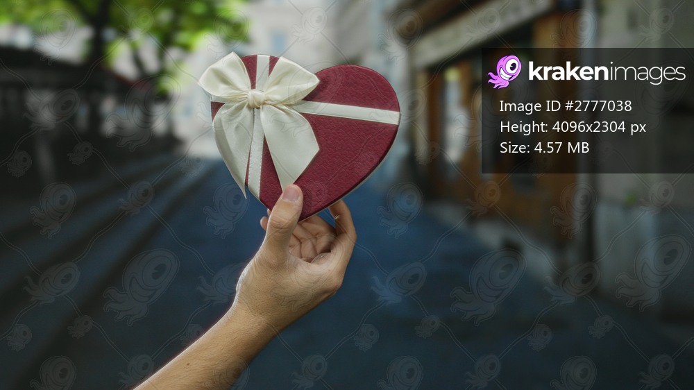 Man holding red heart-shaped gift with white bow on a city street, emphasizing love and romance outdoors in an urban setting.
