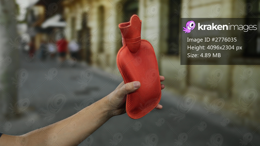 Man holding red hot water bottle on a city street, showcasing close-up details of the hand and the vivid urban background.