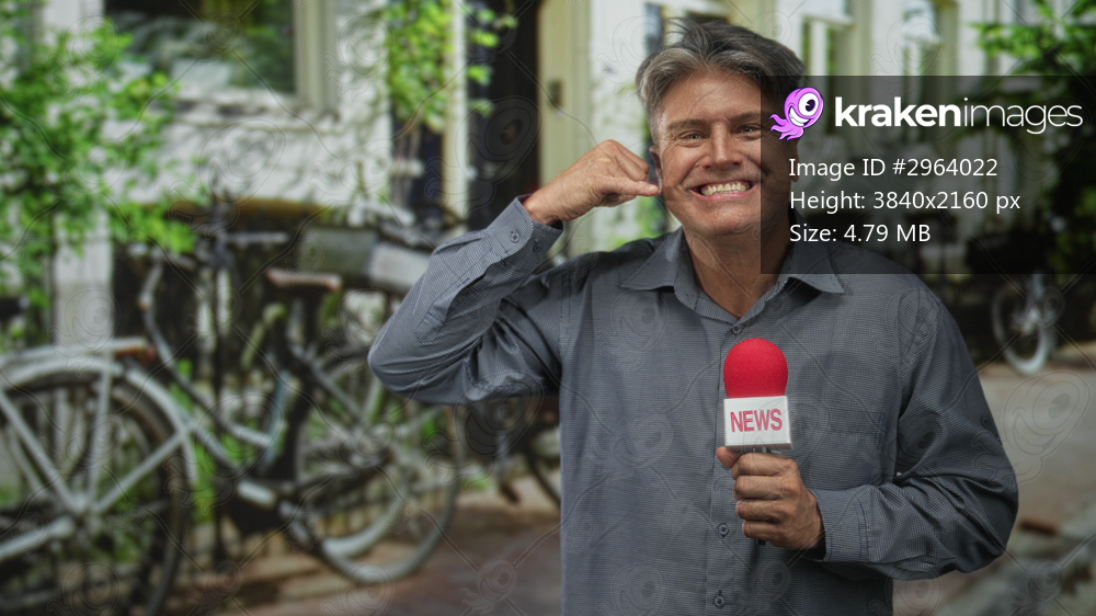 Man holding red microphone labeled news, smiling and making phone gesture to ear on a street with bicycles and buildings; playful humor.