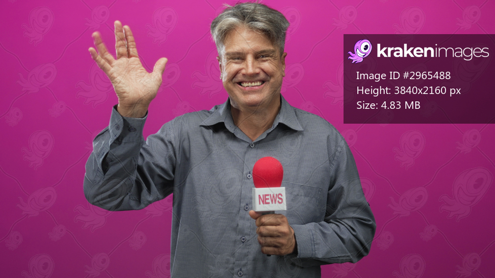 Man holding red microphone labelled news with both hands, eyes closed and speaking in studio; serious reporting.