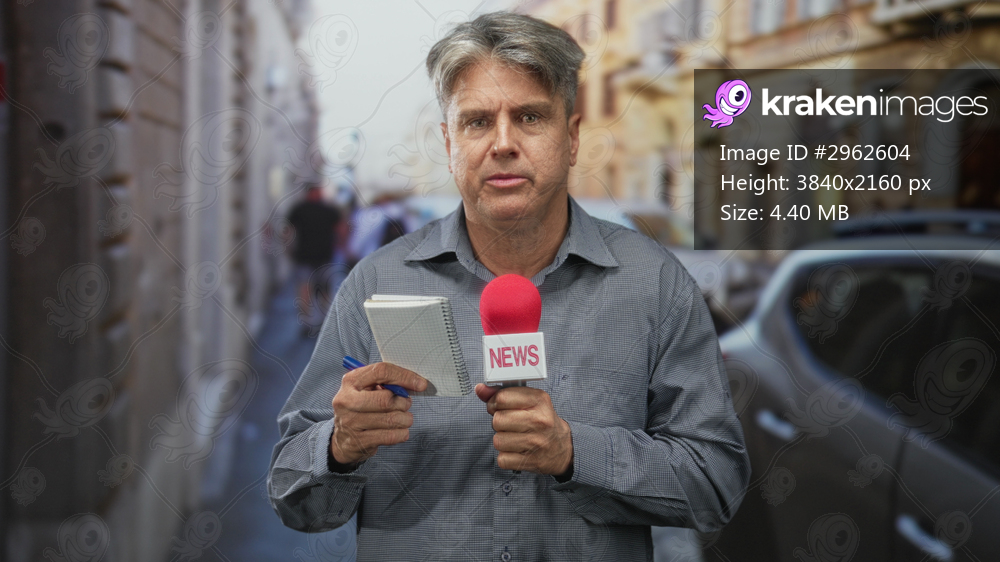 Man holding red microphone and notebook, reading notes while speaking on a narrow city street; live reporting serious.