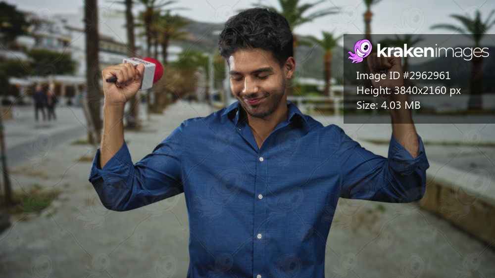 Man holding red microphone raises his arms, smiles broadly, and walks past palm trees on a street promenade; joy celebration.