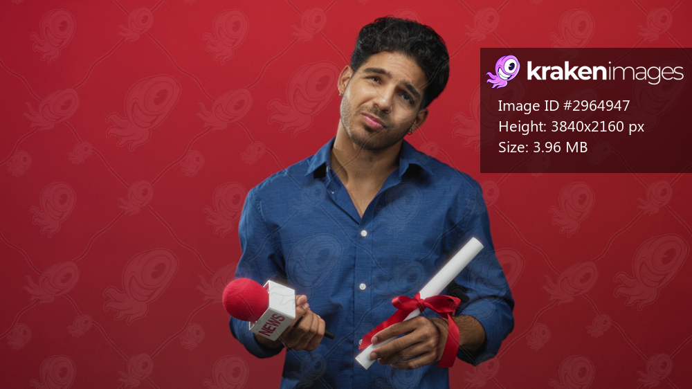 Man holding red news microphone and ribboned diploma with hands visible against a red backdrop in studio; thoughtful contemplation.
