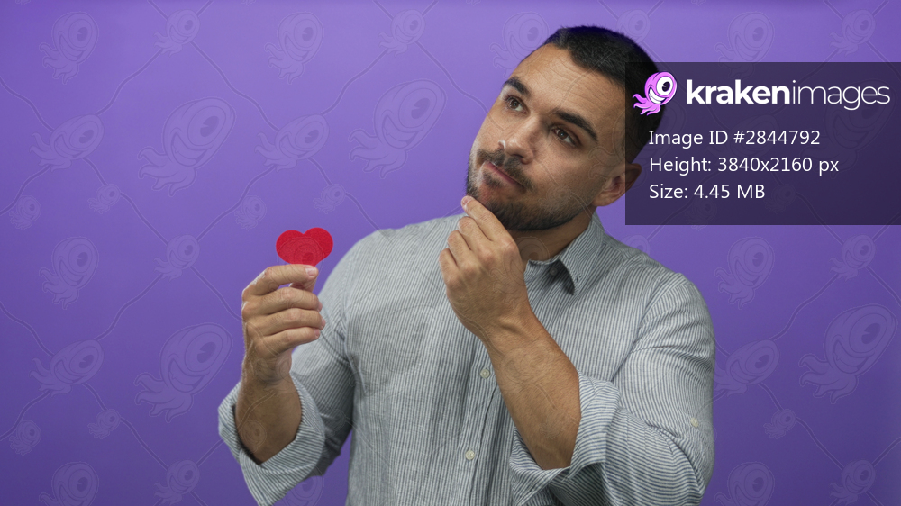 Man holding red paper heart wearing striped shirt with thoughtful hand on chin gesture in purple studio; introspection.