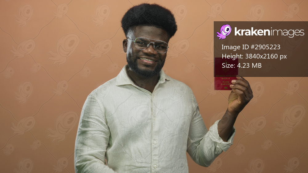 Man holding red passport and finger pointing to passport in studio against peach wall; travel confidence.