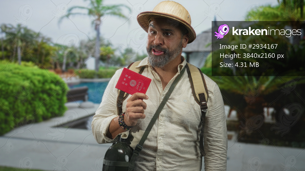 Man holding red passport and oxygen tank at pool building, holding card up to camera with pith helmet and backpack; adventure travel playful.