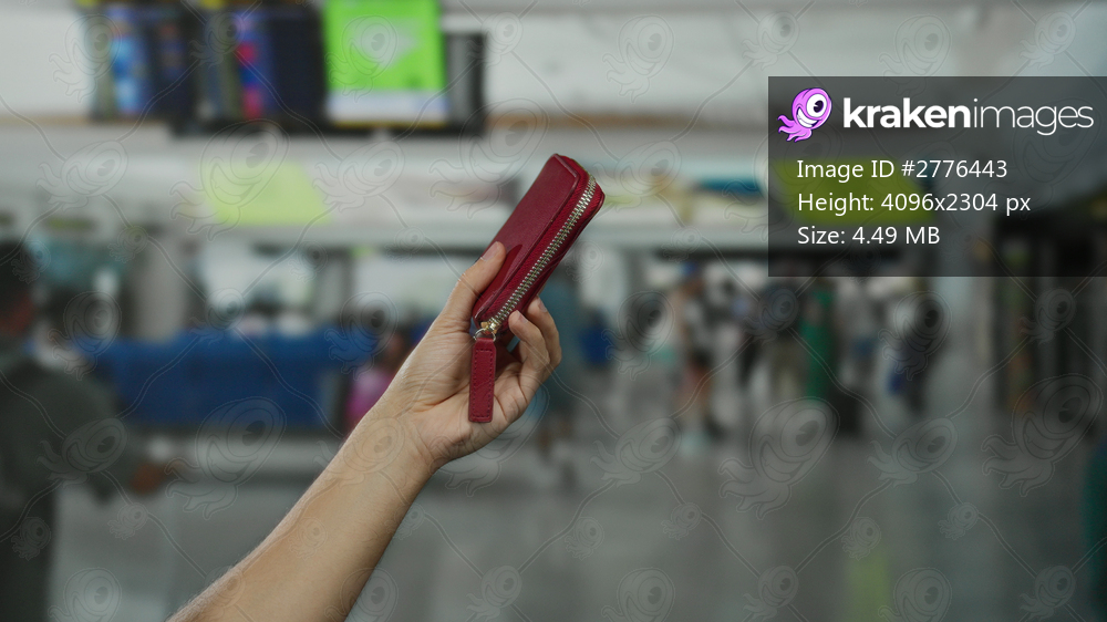 Man holding red wallet in airport terminal with blurred travelers in the background, emphasizing travel and movement.