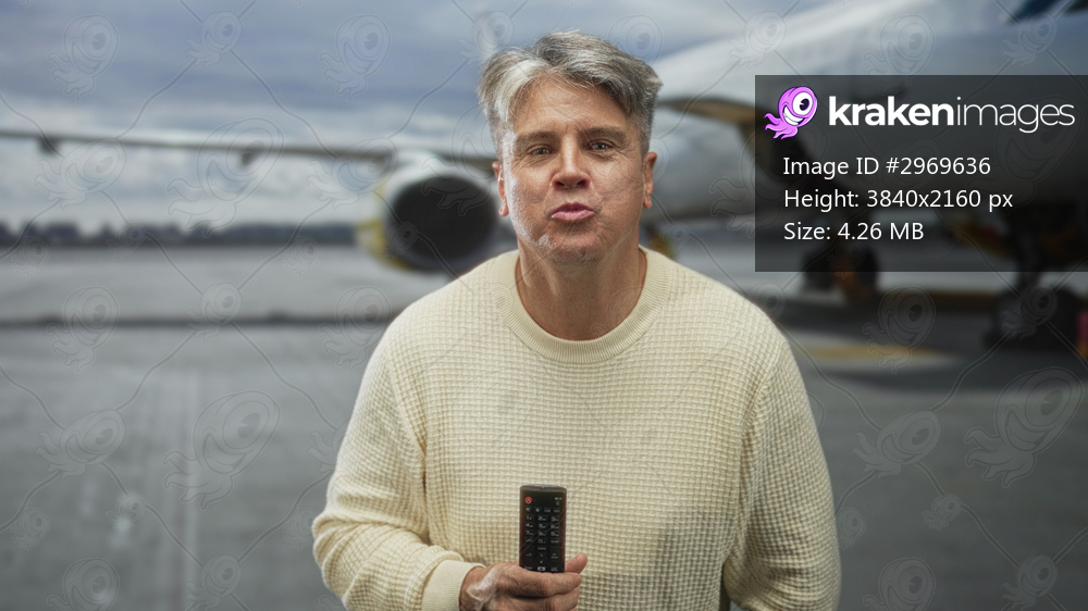 Man holding remote control with right hand, smiling in front of airplane on airport tarmac wearing cream sweater; happiness travel.