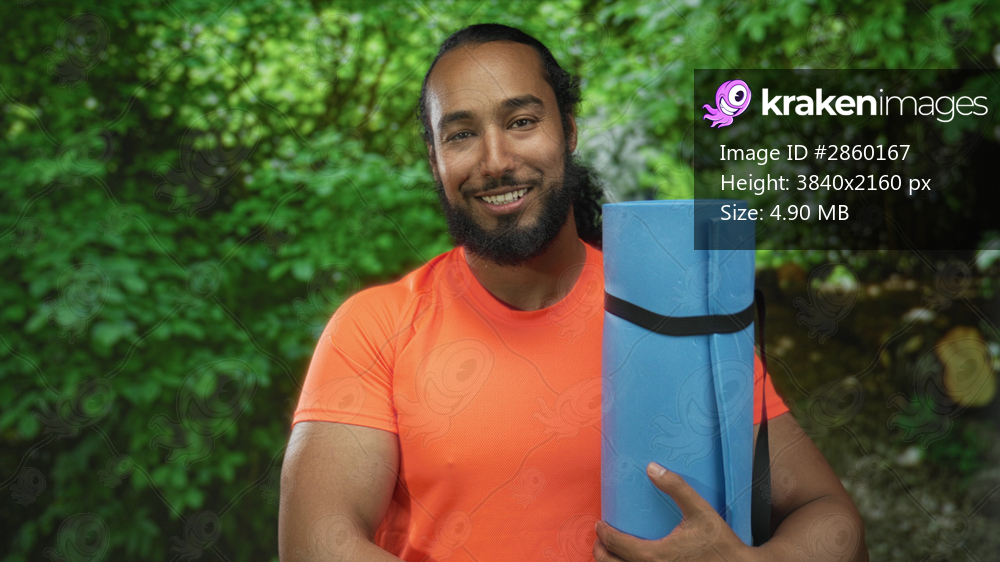 Man holding rolled blue yoga mat in forest park wearing bright orange shirt, smiling and looking down while cradling the mat; serenity.
