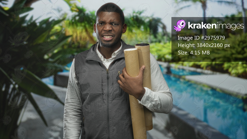 Man holding rolled blueprints by chest while pumping fist and smiling beside a modern building poolside; confidence success.