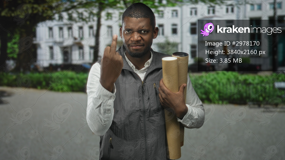 Man holding rolled blueprints shows middle finger toward camera in street with stern expression and vested shirt, standing near city buildings; defiance. - Kraken Images