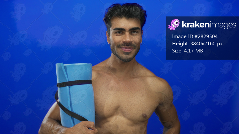 Man holding rolled yoga mat against lean bare chest in bright blue studio; confidence strength wellness fitness.