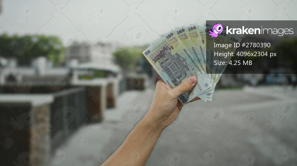 Man holding romanian banknotes on an outdoor city street, showcasing currency exchange and finance in an urban environment.