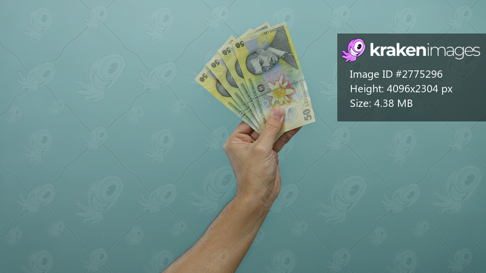 Man holding romanian lei banknotes against a blue background, showcasing currency and finance in a simple, isolated setting.