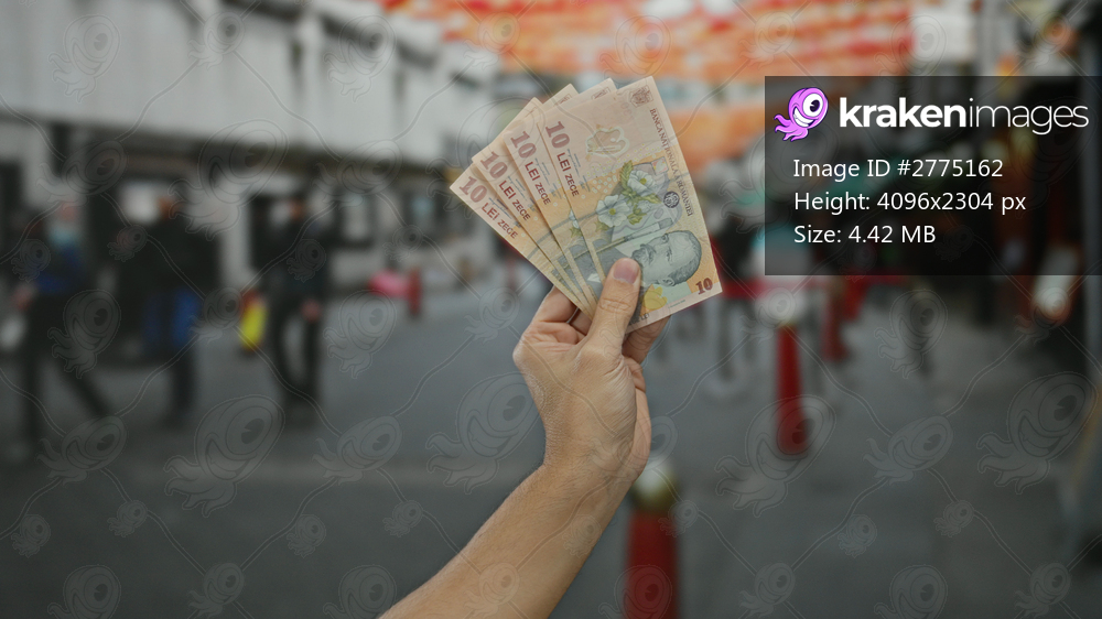 Man holding romanian lei banknotes in an urban street setting, showcasing pristine currency against a bustling city backdrop, highlighting financial exchanges in a vibrant town. - Kraken Images