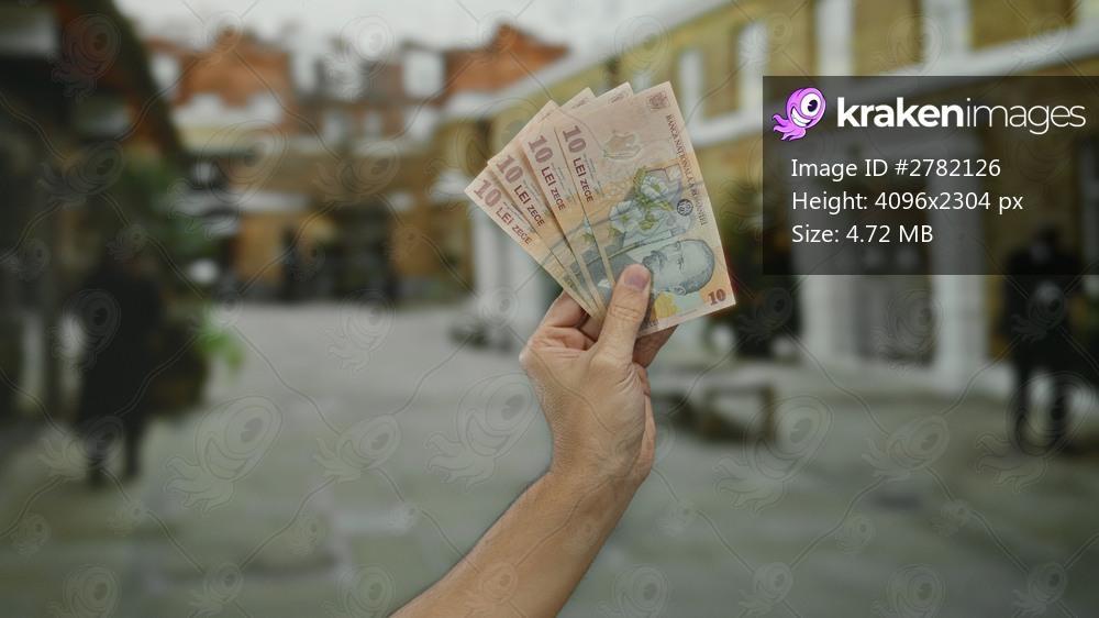 Man holding romanian lei banknotes on an urban city street, showcasing financial themes in an outdoor european setting.