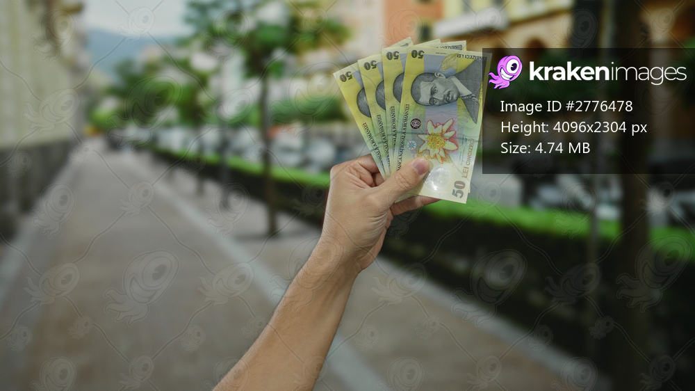 Man holding romanian leu banknotes on city street showcasing local currency in an outdoor setting with a blurred urban background and trees lining the path. - Kraken Images