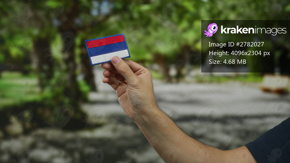 Man holding russian flag patch outdoors in a sunny park setting, showcasing caucasian hand and colorful embroidery with a blurred natural background.