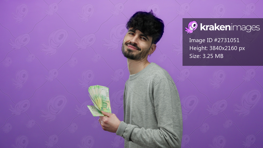 Man holding russian ruble banknotes on a vibrant purple background, showcasing wealth and economic concept with a confident smile.