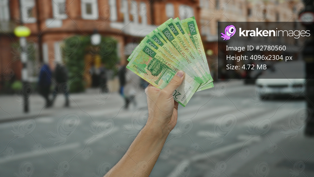 Man holding russian rubles in hand outdoors in city setting, showcasing currency prominently against urban background with blurred pedestrians and buildings. - Kraken Images