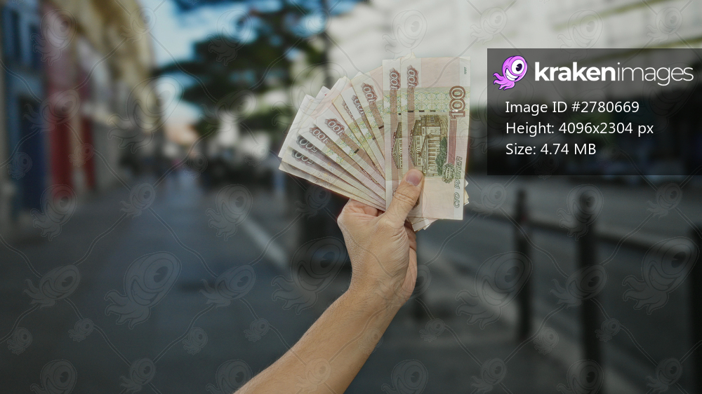 Man holding russian rubles in his hand on a city street, showcasing currency in an outdoor urban setting.