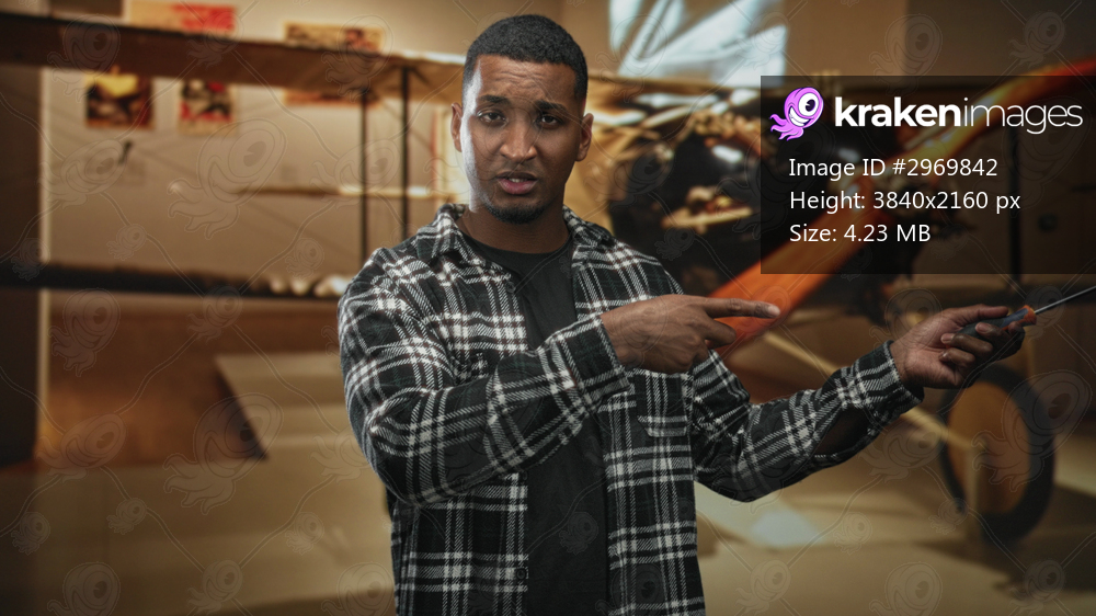 Man holding screwdriver pointing finger in building with biplane exhibit and wooden propeller visible, gesturing repair work; instructional confidence. - Kraken Images