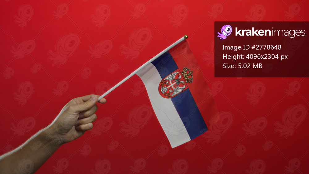 Man holding serbian flag against red background with isolated hand, depicting national pride and male identity.