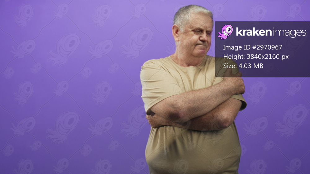 Man holding shoulder with crossed arms in studio wearing beige tshirt against purple backdrop, slight grimace suggests shoulder pain; discomfort aging resilience. - Kraken Images