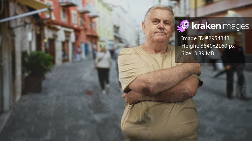 Man holding shoulder with crossed arms on street lined with storefronts and cobblestone pavement; solitude contemplation.