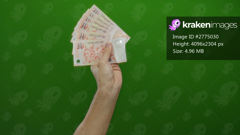 Man holding singapore banknotes against a green wall in an isolated setting, showcasing financial concept with a focus on currency and economy.