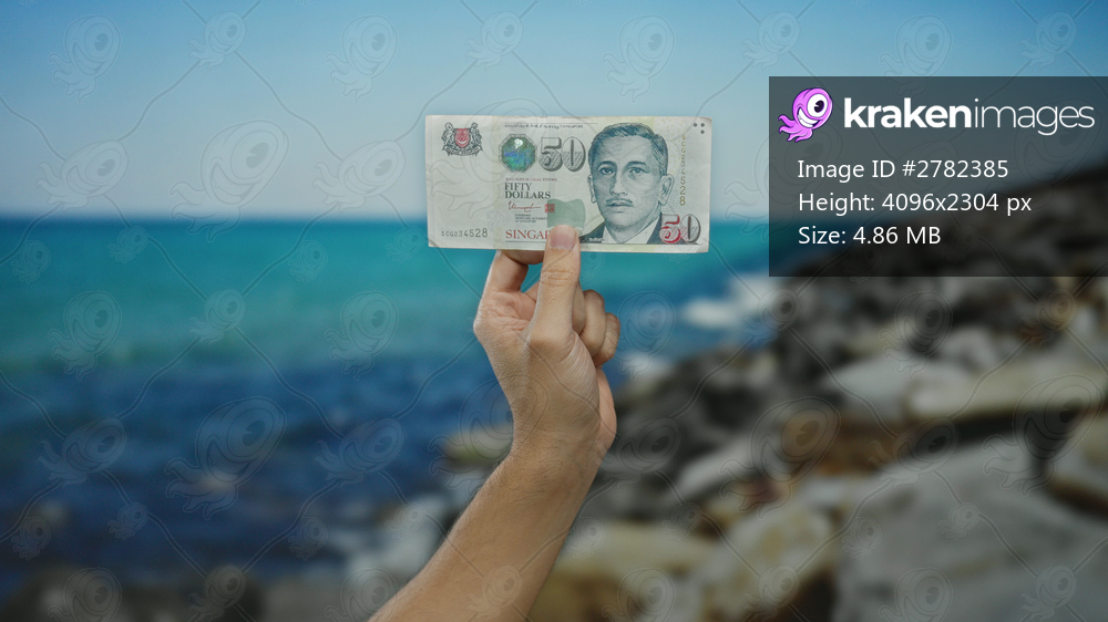 Man holding singapore dollar banknote against a picturesque beach, highlighting travel and financial freedom in a serene seaside environment.