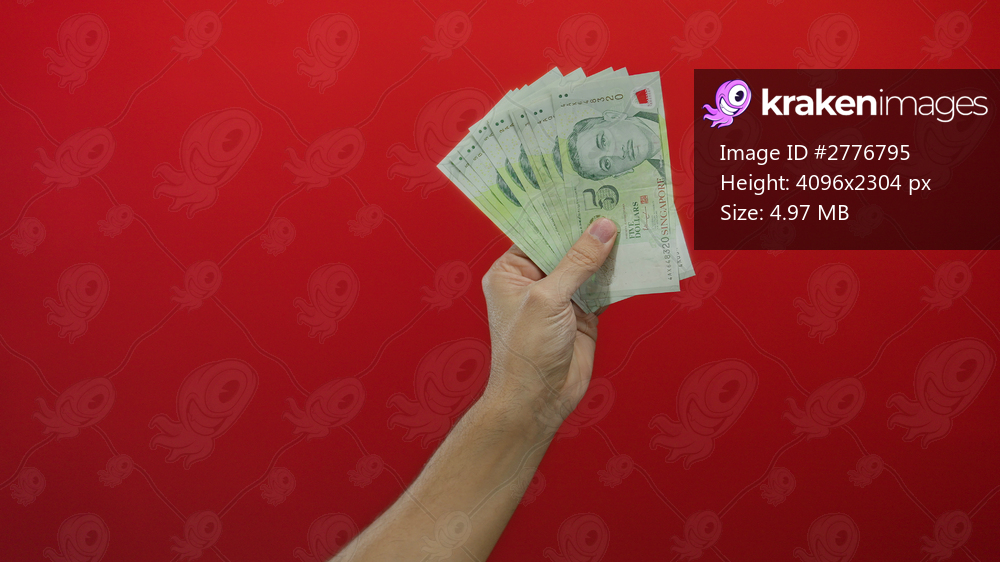 Man holding singapore dollars against a vibrant red wall, showcasing a spread of currency with a confident grip, highlighting the concept of wealth and financial transactions. - Kraken Images