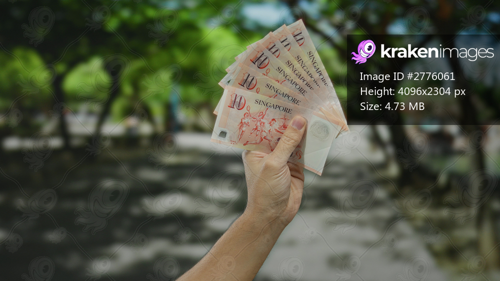 Man holding singapore dollars in an outdoor park setting with blurred green trees in the background.