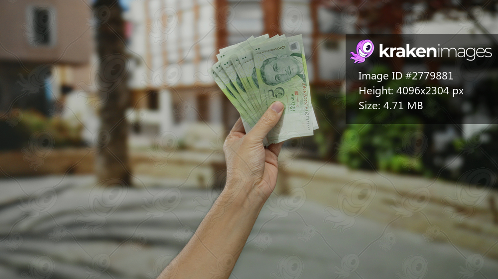 Man holding singapore dollars on a city street, displaying banknotes prominently in an outdoor urban setting with a blurred town background.