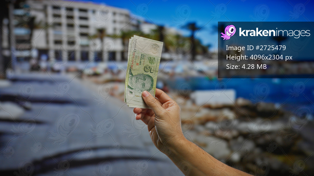 Man holding singapore dollars on a seaside street, capturing a vibrant summer vacation atmosphere with clear blue sea and palm trees in the background. - Kraken Images